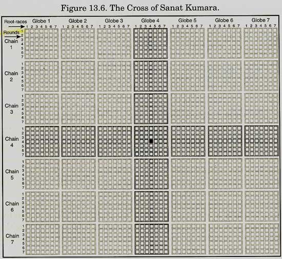 The 4th subrace of this 4th Root Race represented the midpoint of the 4th round (S4.C4.G4.Rn.4.R4.4) and emerged 10 to 12x106 years ago. This was a crucial point in the planetary history as it reenacted the battle between the Forces of Light and the Dark Forces begun in the Third Chain (next upper chain from the filled middle square in Figure 13.6), the Lunar Chain, whose evolution was aborted by the conflict. Our current satelite, the Moon, represents the physical residue of that chain and is considered a dead, slowly decaying body.